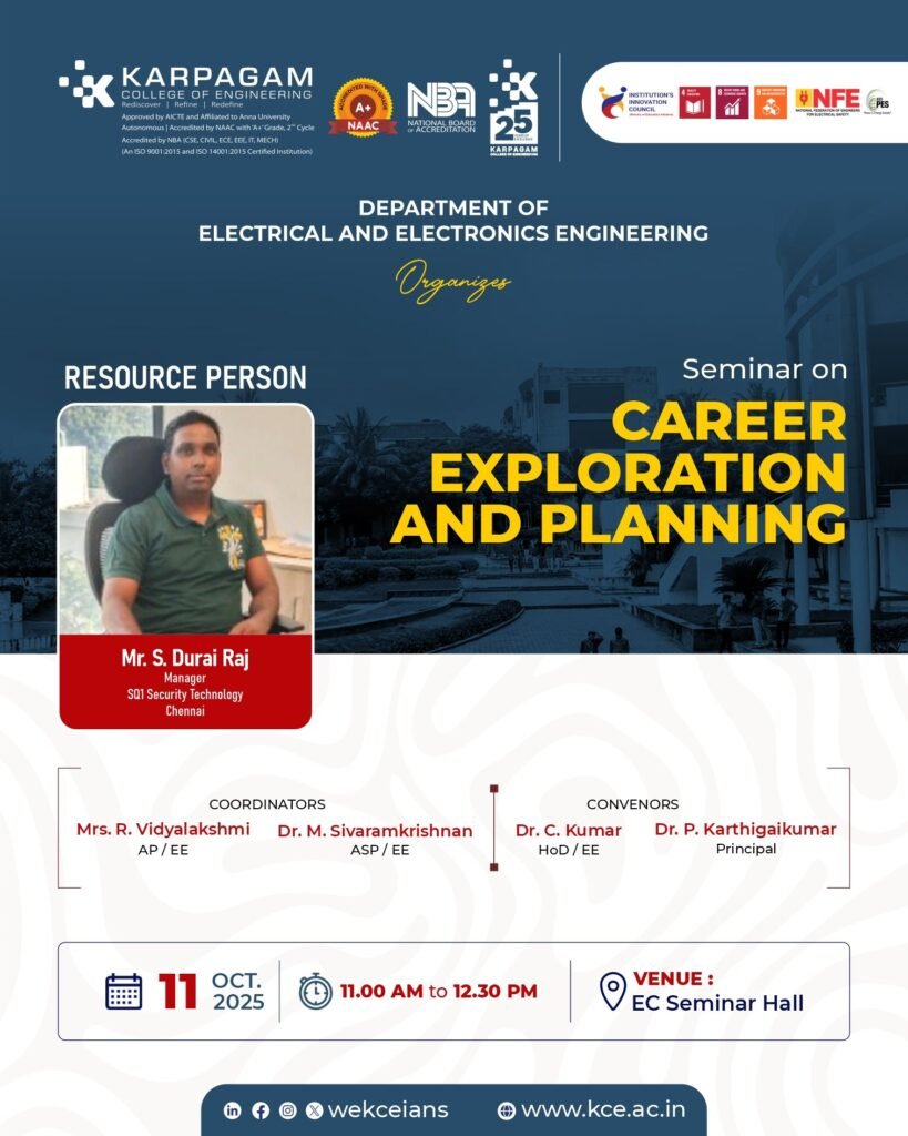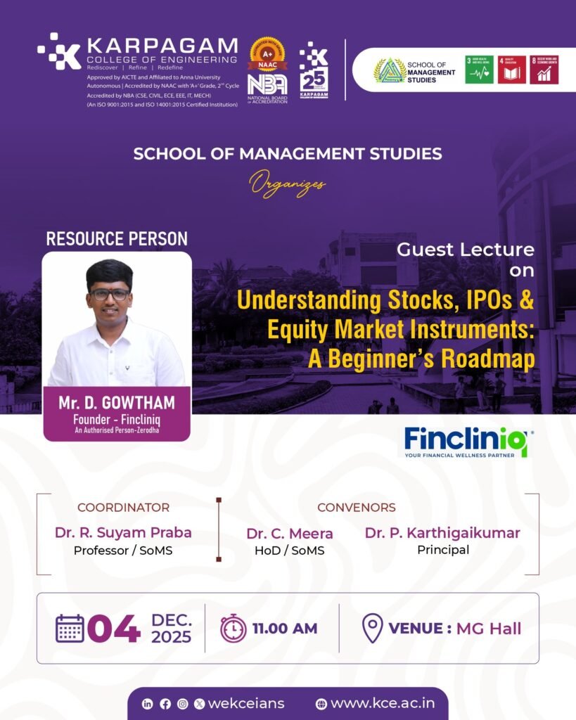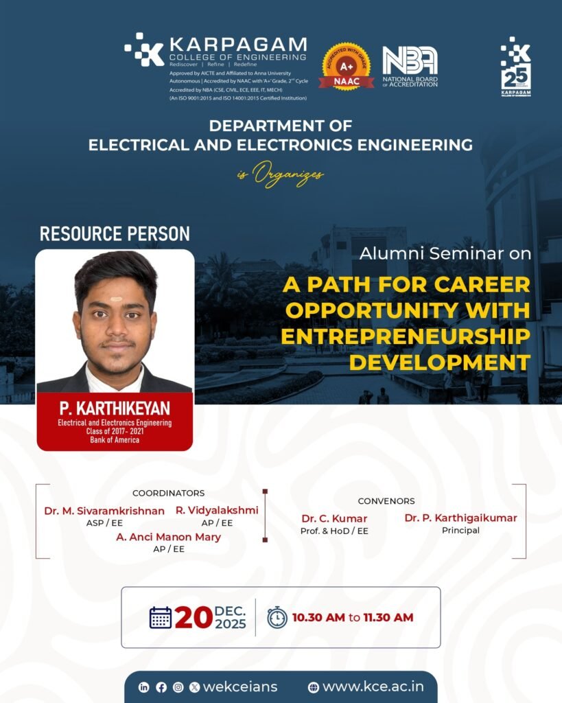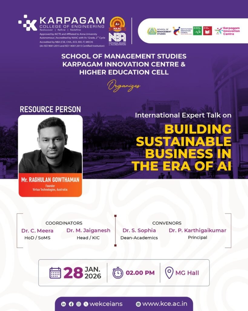 Date: 28.01.2026Title: International Expert Talk – “Building Sustainable Business in the Era of AI”Venue: B Block (MG Hall) Format The School of Management Studies, Karpagam Innovation Centre, and Higher Education Cell of Karpagam College of Engineering jointly organized an International Expert Talk on “Building Sustainable Business in the Era of AI” on 28th January 2026 at MG Hall. […]