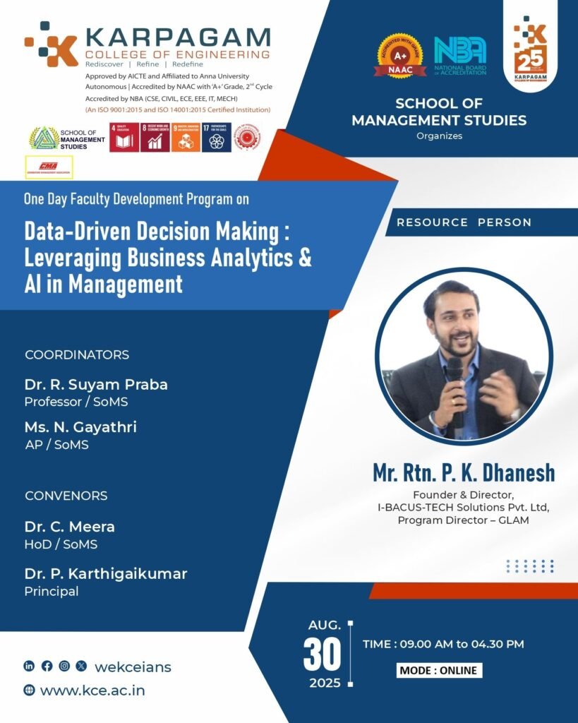 School of Management Studies, Karpagam College of Engineering, CoimbatoreDate: 30th August 2025 1. Introduction The School of Management Studies, Karpagam College of Engineering (KCE), Coimbatore, successfully organized a One-Day Faculty Development Programme (FDP) on “Data-Driven Decision Making: Leveraging Business Analytics & AI in Management” on 30th August 2025 at the institution’s academic seminar hall. The initiative aimed to enhance […]