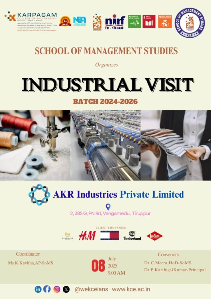School of Management Studies, Karpagam College of Engineering, CoimbatoreAn industrial visit to AKR INDUSTRIES PVT. LTD., Tirupur, was successfully organized by the School of Management Studies, Karpagam College of Engineering on Tuesday, 08th July 2025. A total of 42 students, accompanied by two faculty members — Mrs. K. Kavitha and Mrs. Gayathri N. — participated in the visit […]