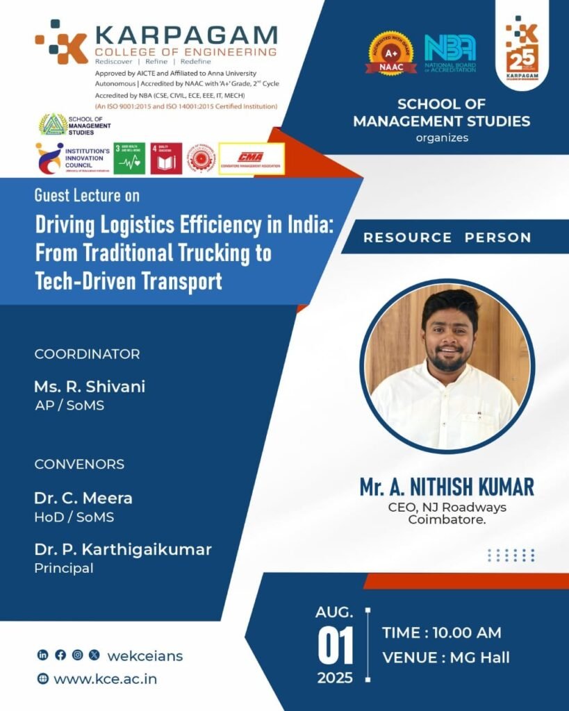 Date: August 1, 2025Place: MG Hall School of Management Studies at Karpagam College of Engineering organized an expert guest lecture on August 1, 2025, titled “Driving Logistics Efficiency in India: From Traditional Trucking to Tech-Driven Transport.” The session took place at MG Hall at 10:00 AM. This event was conducted under the coordination of Ms. R. Shivani, […]
