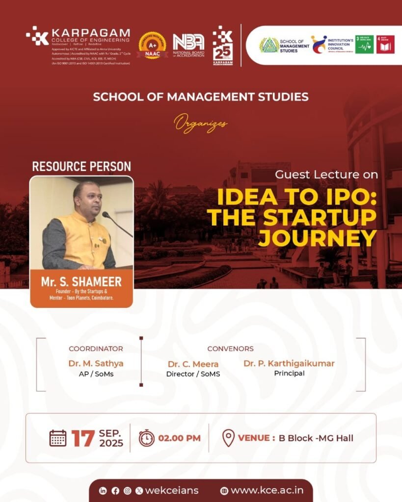 Date: SEPTEMBER 17, 2025Place: MG Hall The School of Management Studies, Karpagam College of Engineering (KCE), organized a Guest Lecture Programme on the theme “Idea to IPO: A Startup Journey”, aimed at nurturing the entrepreneurial spirit among students and providing them with real-world insights into the startup ecosystem. The event began with a soulful prayer song, invoking […]