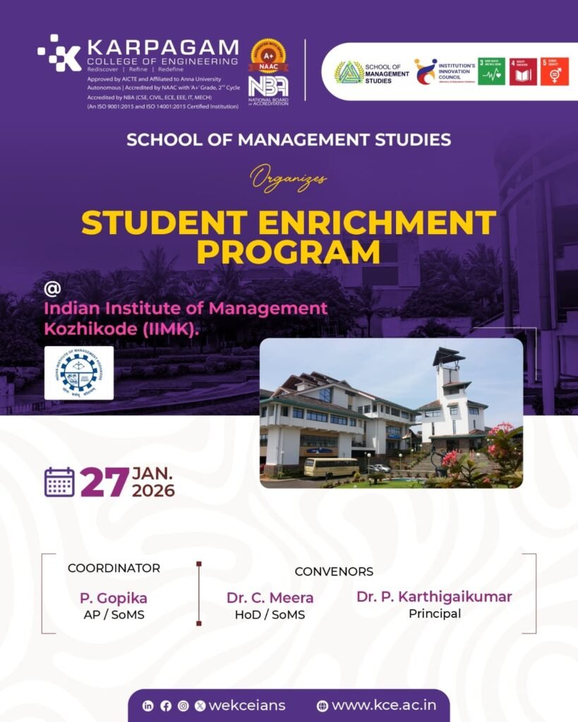 Coordinator: Ms.P.Gopika Convener: Dr.C.Meera Date: 27.01.2026 The School of Management Studies organized a Student Enrichment Program at the Indian Institute of Management Kozhikode (IIMK) with the objective of enhancing students’ academic exposure and strengthening their practical understanding of management education. As part of the program, students visited the IIM Kozhikode Museum and Central Library, where they gained […]