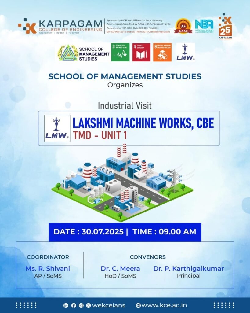 Lakshmi Machine Works, TMD – Unit 1, CoimbatoreDate: 30.07.2025 | Time: 09.00 AM The School of Management Studies, Karpagam College of Engineering, organized an enriching industrial visit for its students to Lakshmi Machine Works (LMW), TMD – Unit 1, located at Periyanaickenpalayam, Coimbatore, on the 30th of July, 2025. This visit was planned with the […]