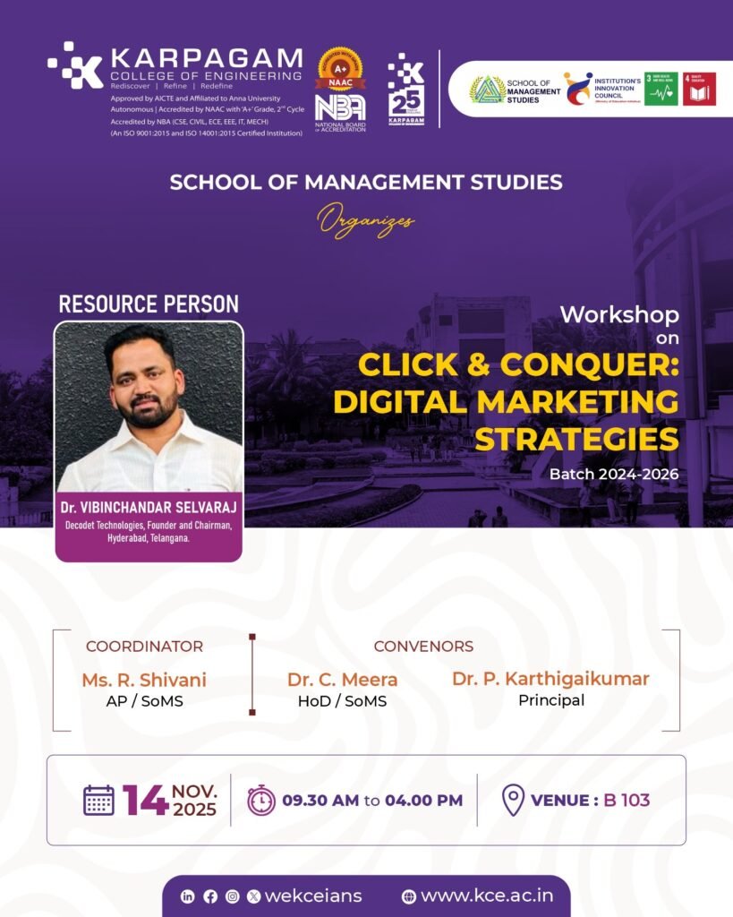 Date: November 14, 2025Place: B 103 School of Management Studies at Karpagam College of Engineering organized a one-day workshop titled “Click & Conquer: Digital Marketing Strategies” on 14th November 2025 for MBA Batch 2024–2026. The session was conducted by Dr. Vibinchandar Selvaraj, Founder and Chairman of Decodet Technologies, Hyderabad. The objective of the workshop was to provide students […]
