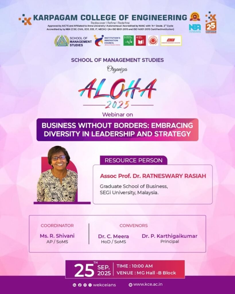 Date: August 1, 2025 Venue: MG Hall – B Block Resource Person: Assoc. Prof. Dr. Ratneswary Rasiah, Graduate School of Business, SEGi University, Malaysia. School of Management Studies, Karpagam College of Engineering, organized ALOHA 2025, a webinar on the theme “Business Without Borders: Embracing Diversity in Leadership and Strategy” on 25th September 2025. The event was designed […]