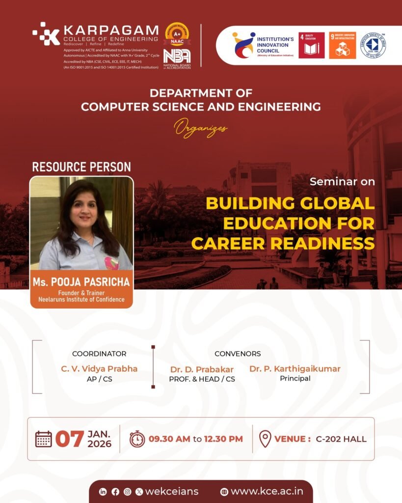 On 30th August 2025, Department of CT and CD, Karpagam College of Engineering, Coimbatore conducted the Career Awareness Program on “Empowering Careers through IT Skills”. The program started at 1:00 PM with a brief introduction about resource person. The Warm Welcome Address was given by Dr. C. N. VANITHA HOD, KCE, the Speaker Introduction was […]