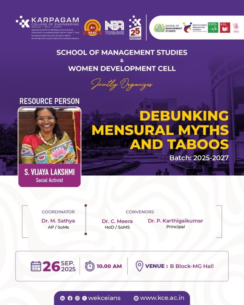 Date: SEPTEMBER 26,2025Place: MG Hall Report on the Women Wellness Programme Title: Debunking Menstrual Myths and Taboos The School of Management Studies and Women Development Cell of Karpagam College of Engineering jointly organized a Women Wellness programme on 26/09/2025 (Friday).The objective of the programme was to create awareness among young women about menstrual health, break the silence surrounding menstruation, […]