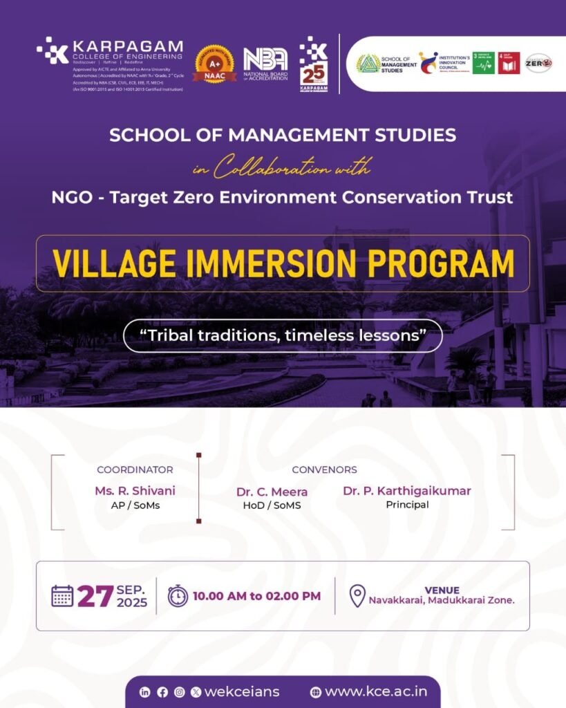 In association with Target Zero –Environmental NGO, and part of our commitment to holistic education and experiential learning, we propose to organize a Village Immersion Program for MBA Students of Batch 2024-2026 on 27.09.2025 Saturday. View More